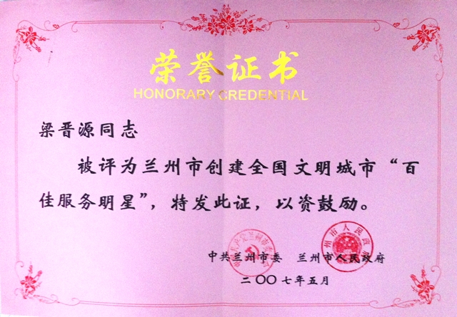 我司梁總被中共蘭州市委評為蘭州市創(chuàng)建全國文明城市”百佳服務(wù)明星“。